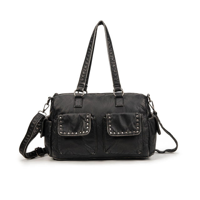 BOLSO PU HOMBRO Y BANDOLERA. BOLSILLOS CON TACHUELAS. EFECTO VINTAGE