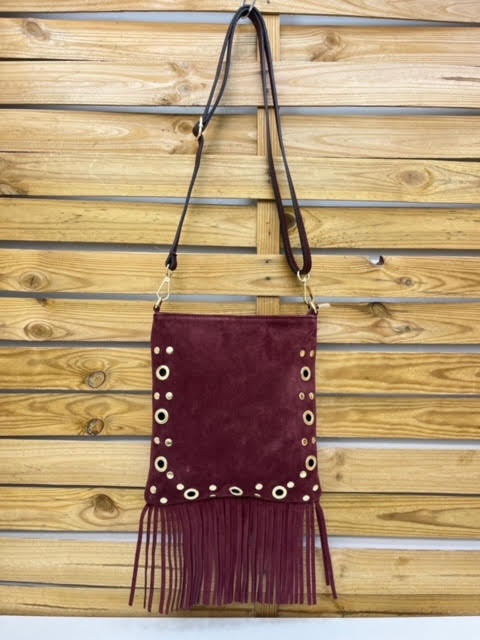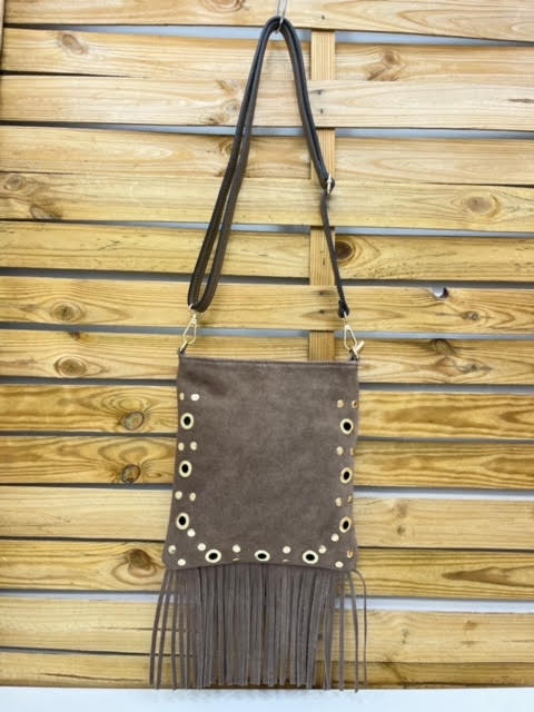 BOLSO PIEL ANTE CON ASA BANDOLERA REGULABLE. FLECOS, TACHUELAS Y TACHUELAS AGUJERO.
