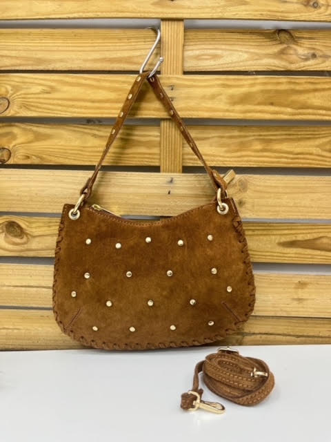 BOLSO PIEL ANTE CON ASA BANDOLERA AJUSTABLE. tACHUELAS Y PESPUNTE A TONO