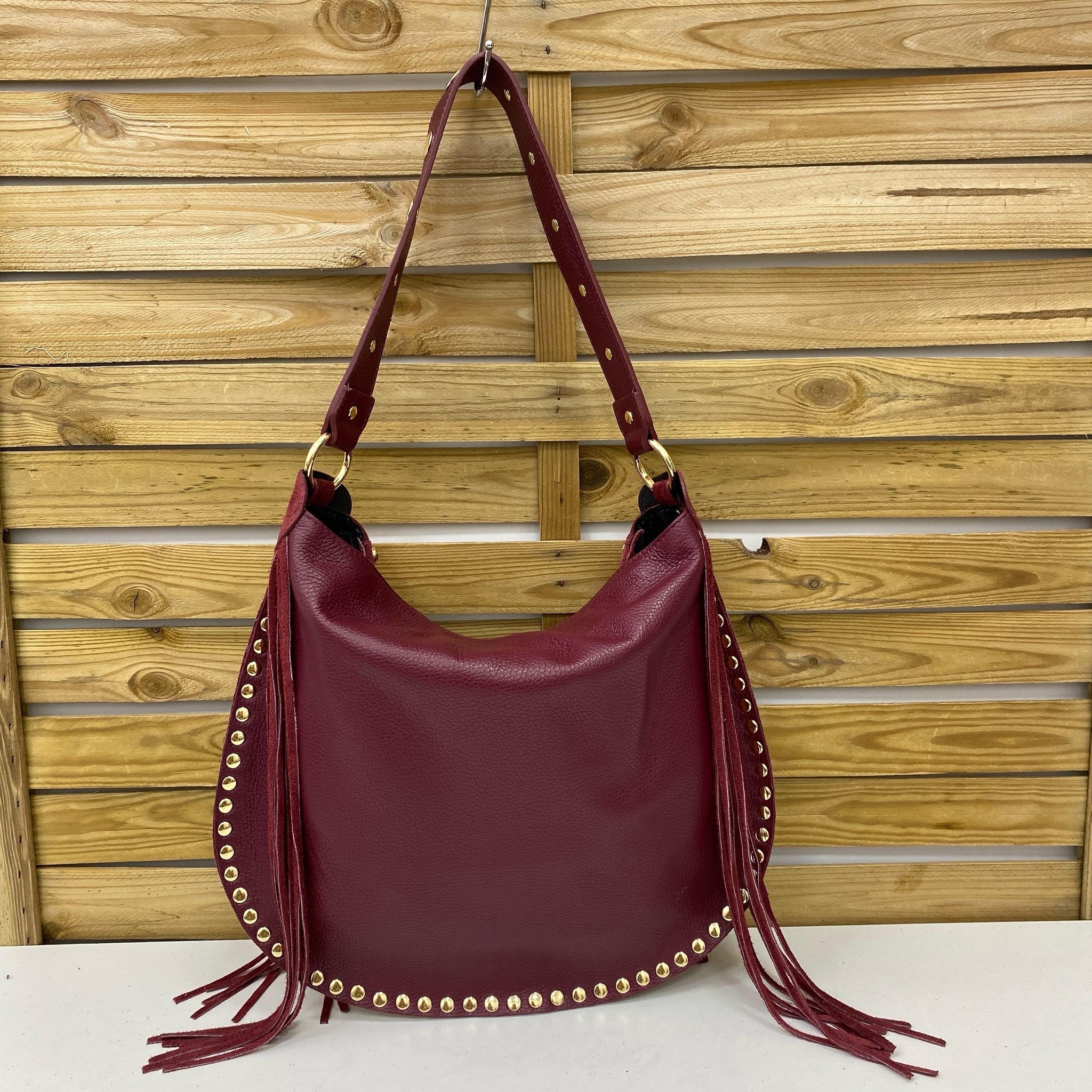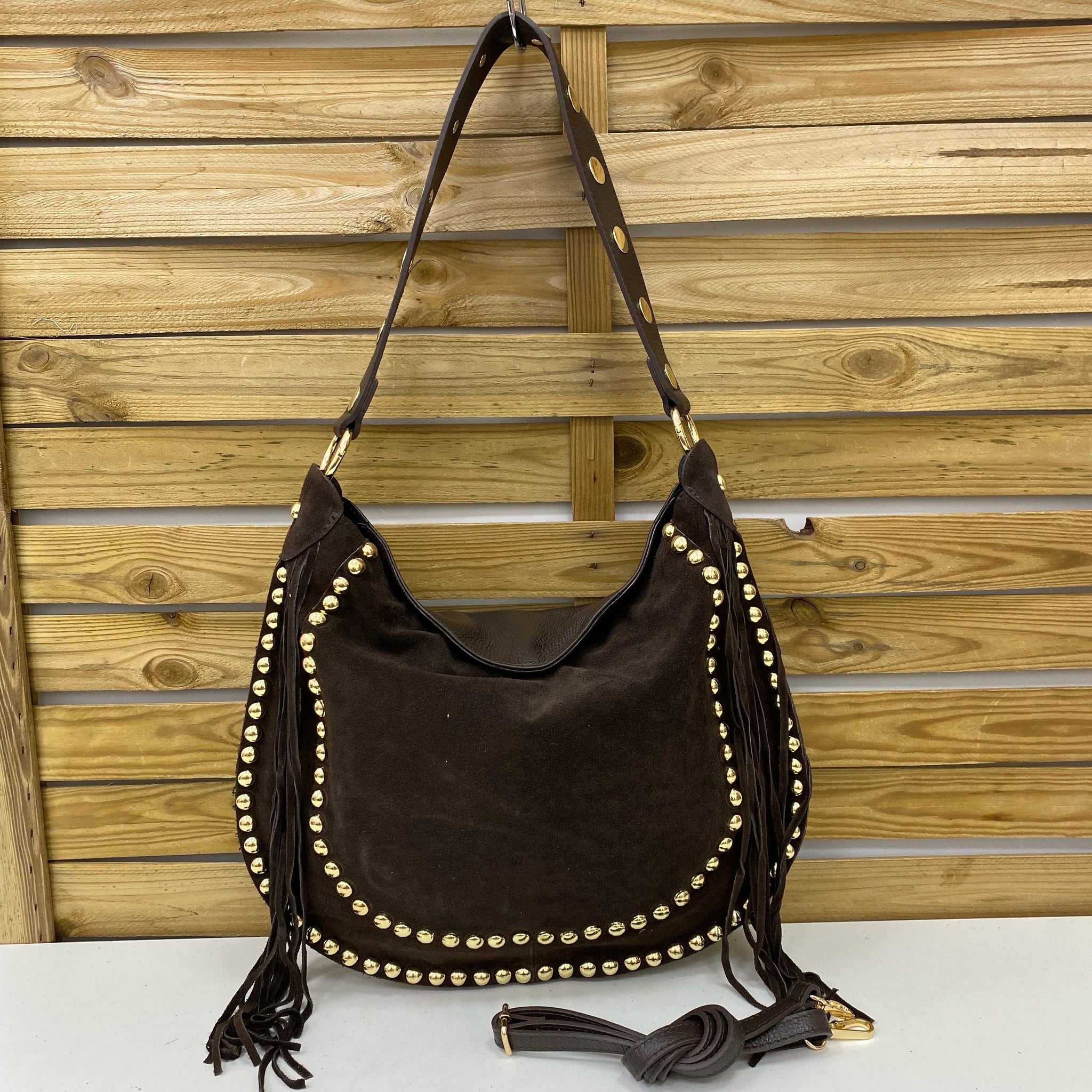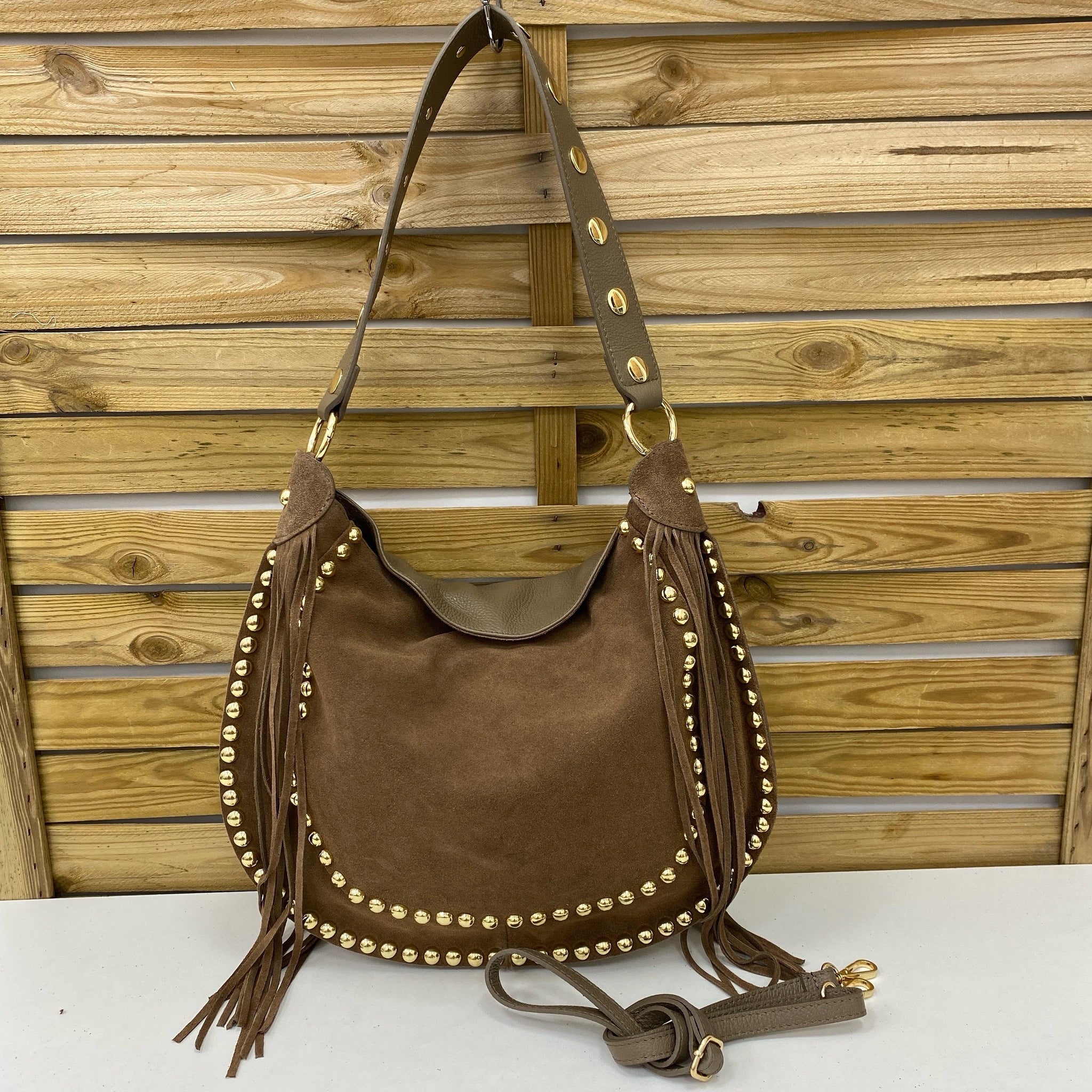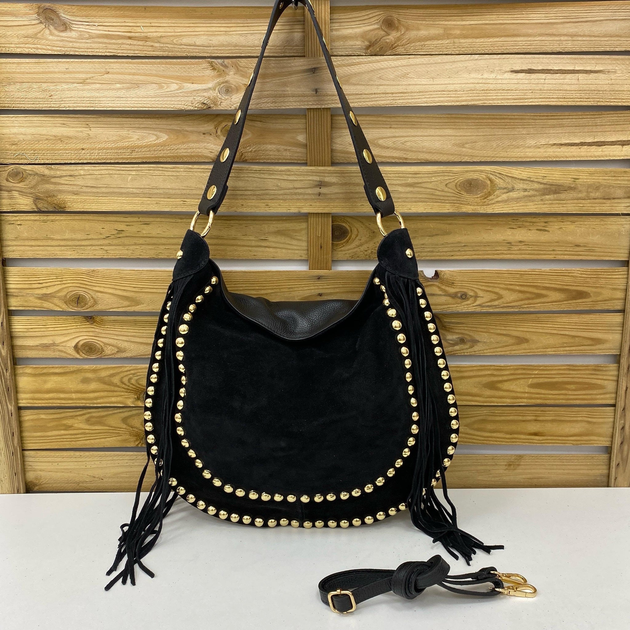 BOLSO PIEL ASA HOMBRO PERFORADA Y BANDOLERA. TACHUELAS EN CONTORNO Y FLECOS. CARA TRASERA PIEL, CARA DELANTERA ANTE