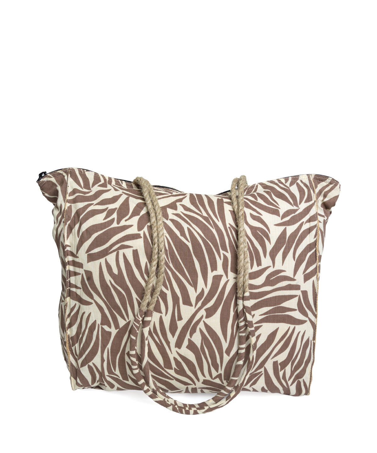 LÍNEA NATURAL SOUL: Bolso shopping con cremallera, cuerpo de algodón natural y asas en yute forrado en algodón, en estampado "BROWN ANIMAL", en un color: tonos naturales, una pieza. Medidas: 38 x 34 x 11 cm. Composición: 100% algodón.