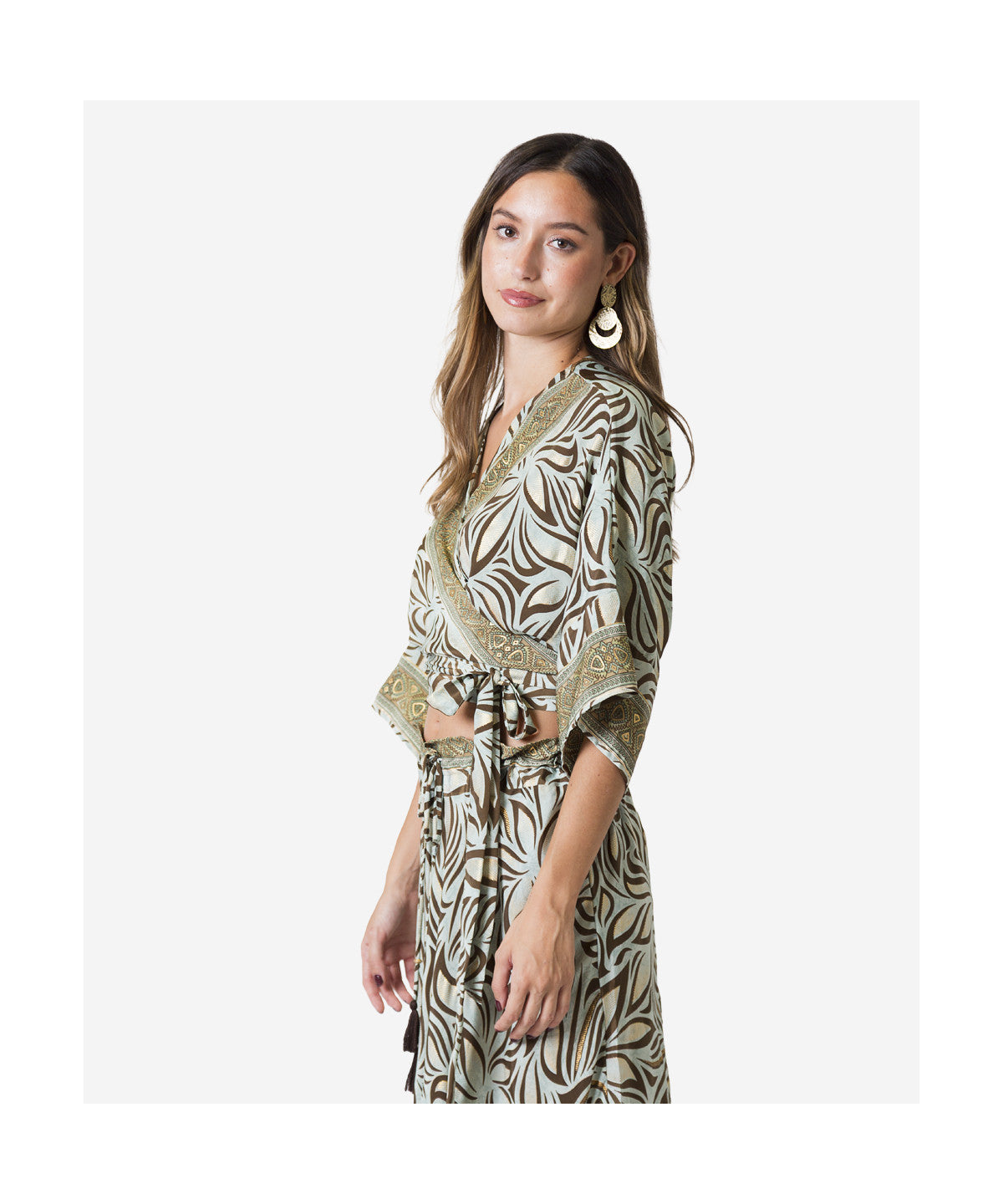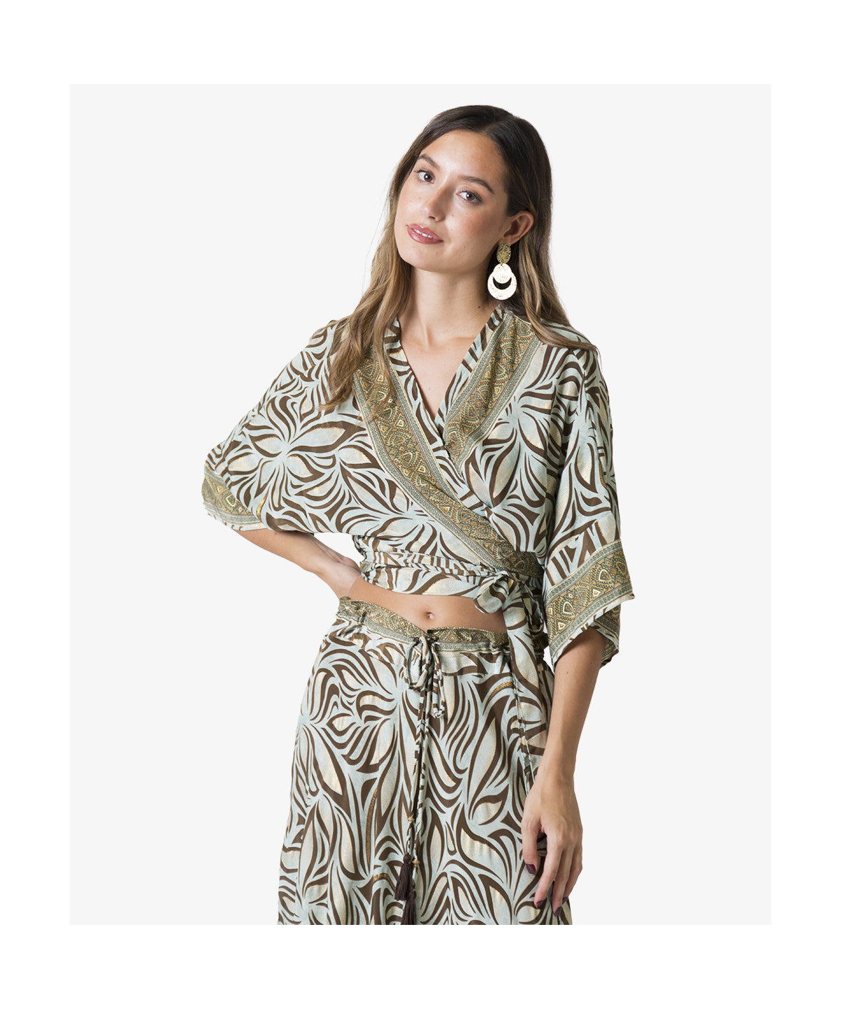 LÍNEA BOHO SOUL: Top cruzado en calidad polysilk, con manga murciélago y cinturón lazo envolvente, en estampado "Aqua Jasmine" en Verde agua y marrón, y borde decorativo en tonos caqui y dorados, en escote delantero y bocamangas. Con ojal para pasar el cinturón en la parte inferior de los costados, en un color: verde agua, una pieza. Talla única. Composición: 100% poliéster.