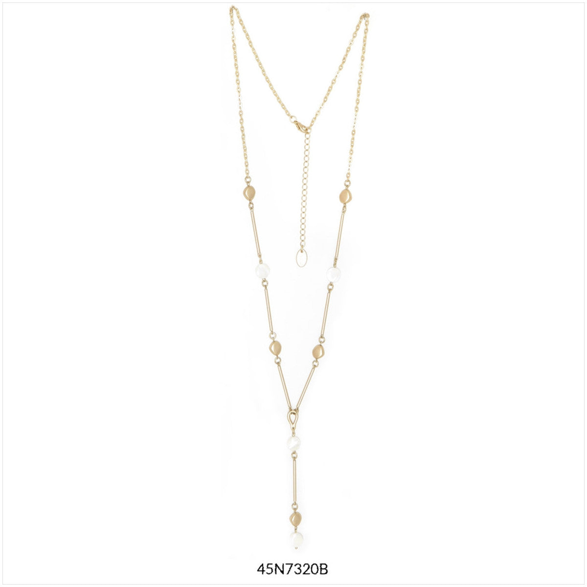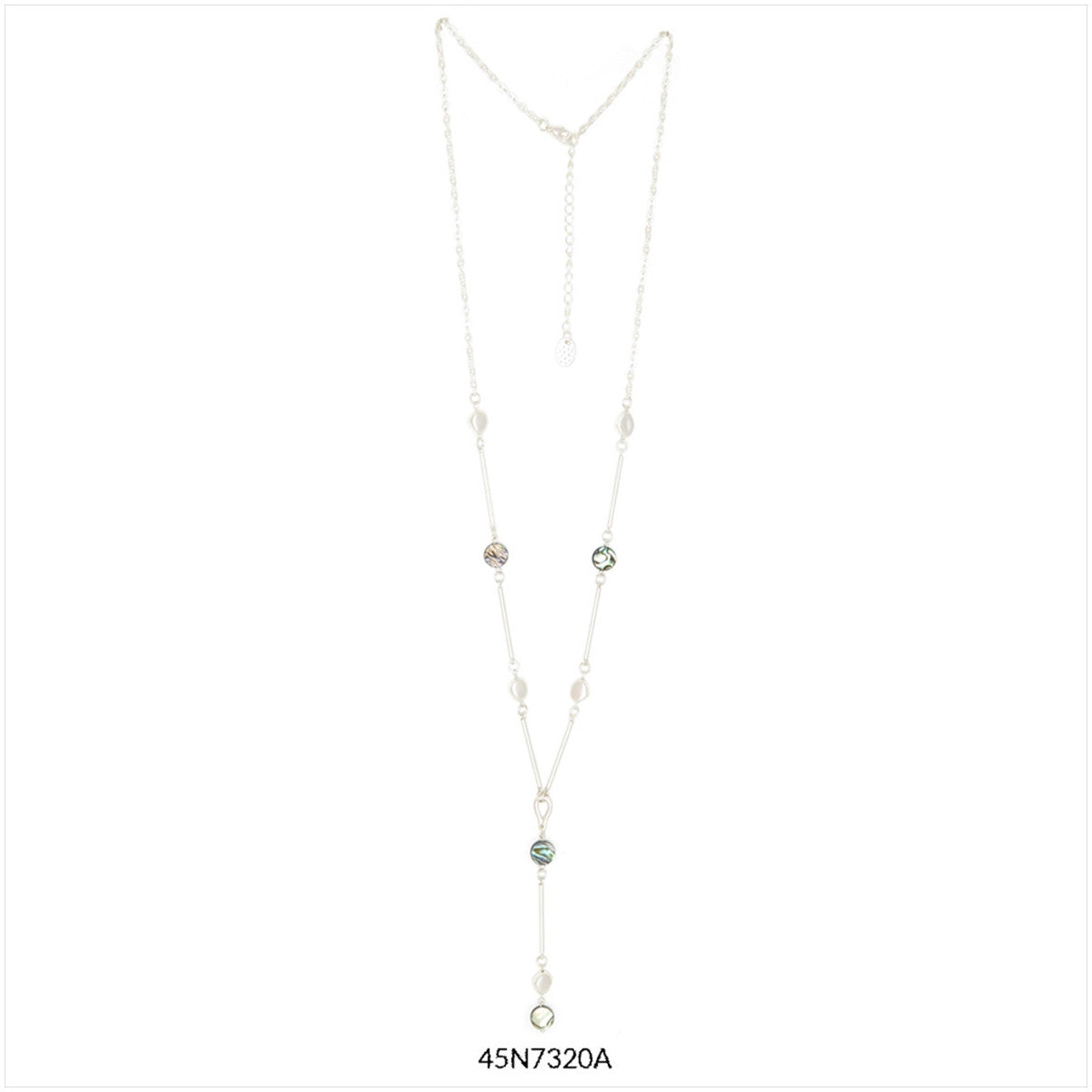 25% latón (tubos), 25% nácar, 25% hierro (cadena), 25% aleación de zinc libre de cadmio, plomo y níquel. Hipoalergénico. 78 cm de largo + 8 cm de cadena ajustable. Colgante de 10 cm de largo.